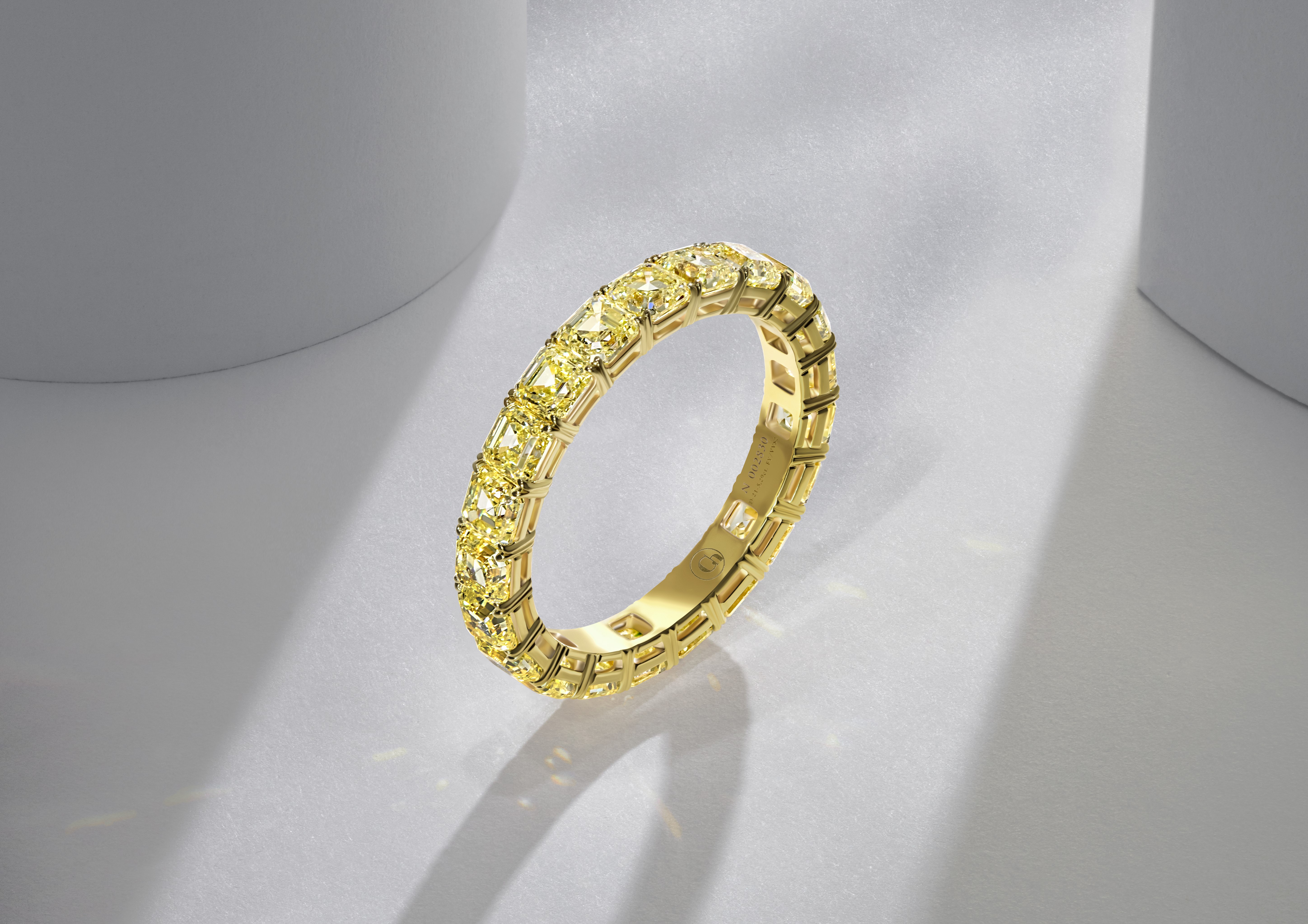 Свое потрясающее золотое сияние они приобретают благодаря присутствию азота в структуре. Он способен поглощать синий цвет, именно поэтому камни становятся желтыми. Интенсивность оттенка зависит от количества азота и того, как его атомы расположены в кристаллической решетке. Если бесцветные бриллианты оцениваются по цветовой шкале от D до Z, то желтые – в зависимости от интенсивности их оттенка. Система оценки присваивает им следующую градацию: фантазийный светлый (fancy light yellow), насыщенный (fancy yellow), глубокий (fancy intense yellow) и яркий (fancy vivid yellow) – самый желанный. Кушон и овал – оптимальные формы для желтых бриллиантов. Фантазийные огранки имеют от 56 до 58 граней, и соответственно, большую площадь поверхности, чем в классической Russian Cut, что максимально увеличивает потенциал передачи цвета камня.