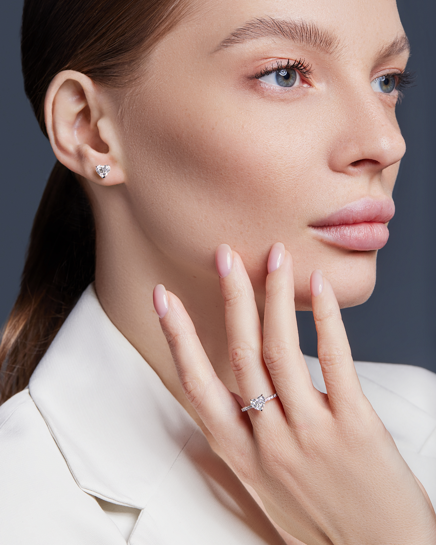 Классическое кольцо наполнит сиянием это радостное мгновение и сохранит в своих гранях светлые воспоминания. Ослепительная бриллиантовая композиция состоит из 17 драгоценных камней. Романтичная огранка «сердце» создает особенное настроение для столь торжественного дня. С этим кольцом прекрасно сочетаются изысканные пусеты, составляющие с ним единый сет.