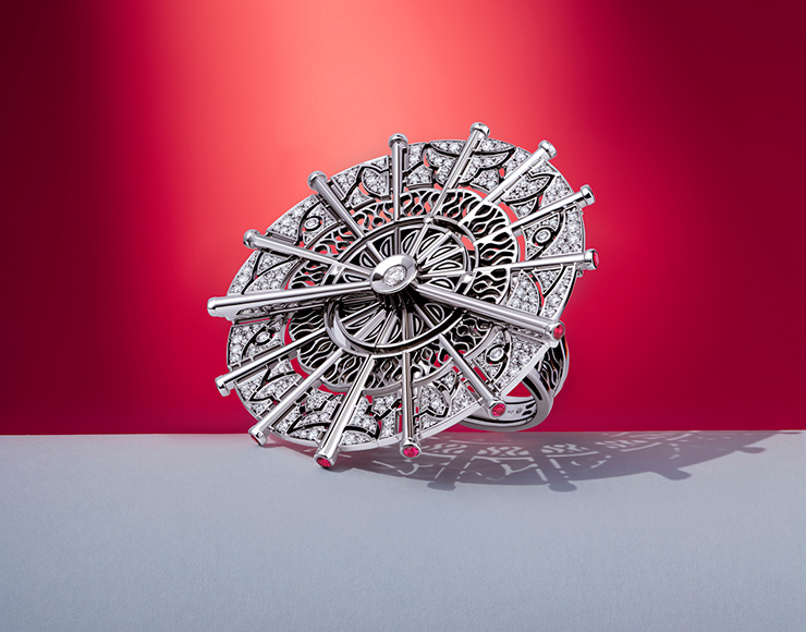 В изысканном кольце с яркой стилистикой ар-деко воссоздан знаковый светский атрибут. Сочетание сияющих бриллиантов и насыщенных рубинов создает ослепительную композицию. Не забывая, что веер не только декоративный, но и функциональный предмет, ювелиры наделили украшение свойством трансформации.  Драгоценные створки веера подвижны, обладательнице остается лишь выбрать понравившееся положение.