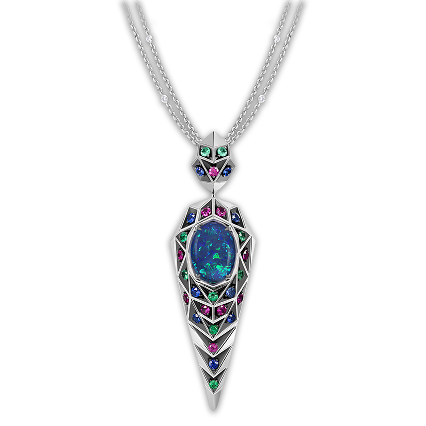 Мерцающие «капли» белых опалов и ритмичные переплетения природных сапфиров, изумрудов и бриллиантов в колье предвосхищают волшебное сияние и насыщенный цвет австралийского черного опала редкого бирюзового оттенка 18,78 ct.