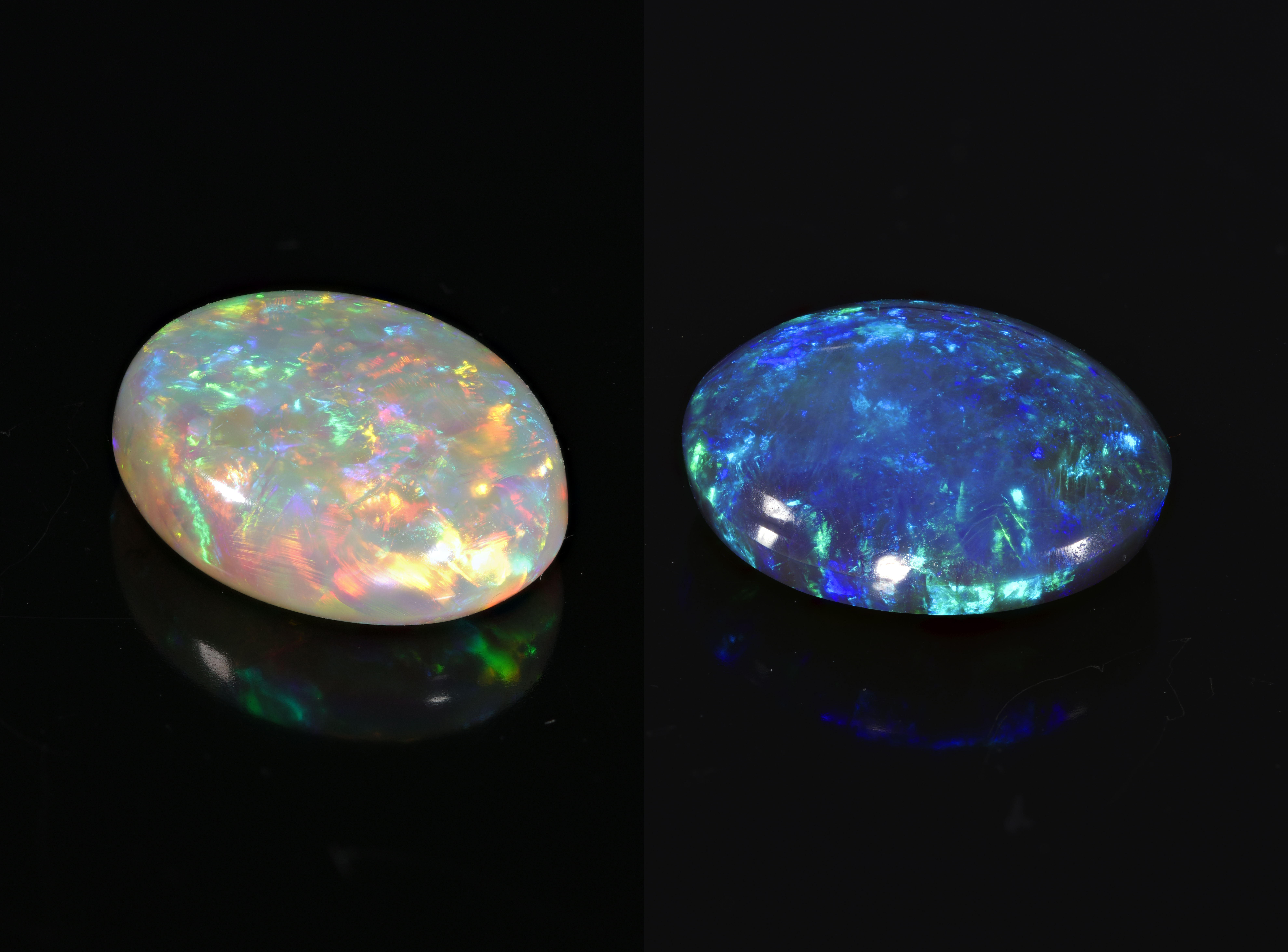 Камень обладает уникальным, присущим только ему, свойством — опалесценцией: свет, касаясь граней опала, преломляется и активирует эффект радужного свечения. В каждом камне это качество раскрывается по своему — в мире нет двух одинаковых опалов. Оттенки камня могут варьироваться по всему спектру, при этом разного цвета может быть и опалесценция, и фон (цвет тела камня). Опал может отображать один, два, три или все цвета радуги.