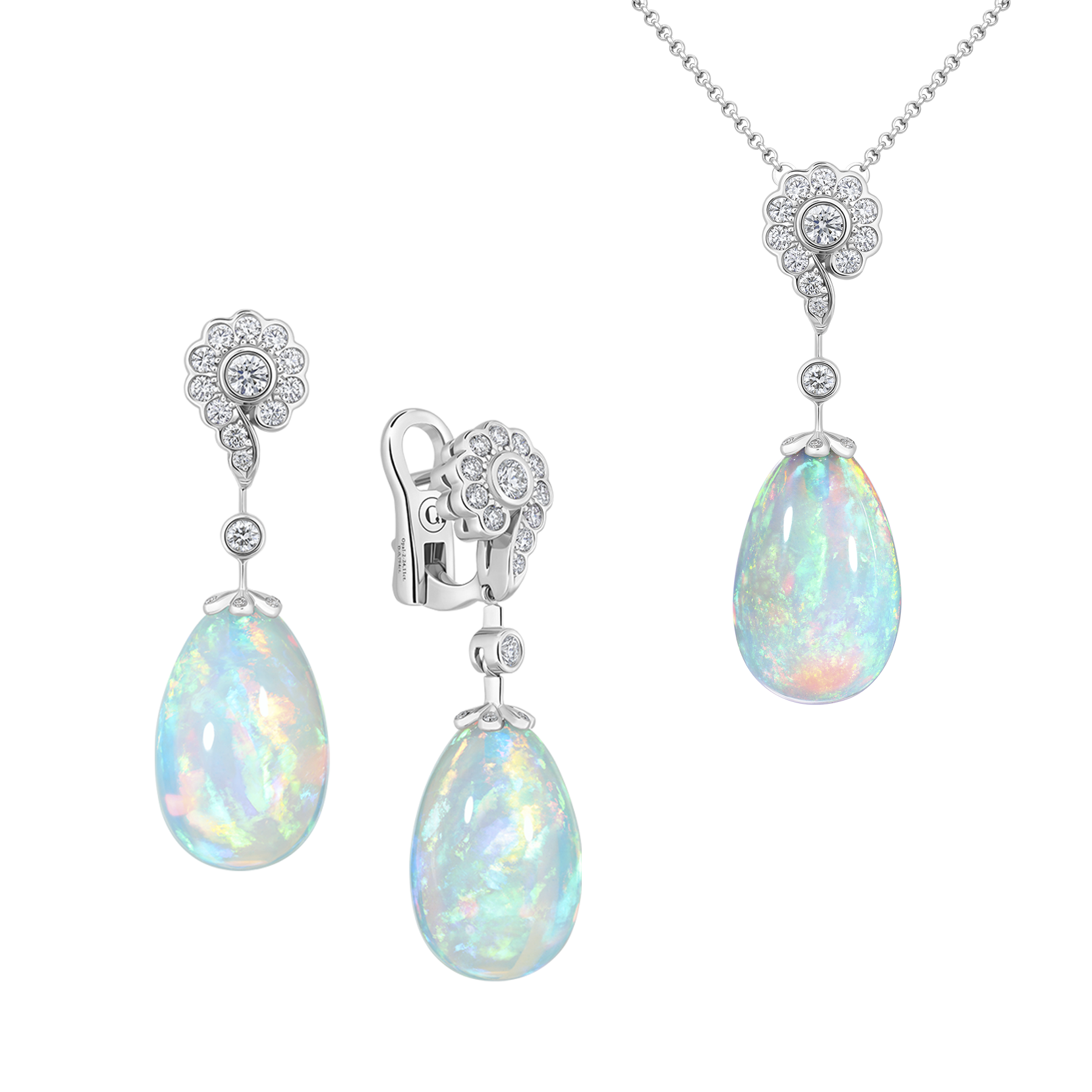 Нежные с радужным мерцанием опалы, россыпь бриллиантов, белое золото, жемчужные нити придают украшению лоск и изысканность, а трансформационные возможности - динамичность и универсальность.