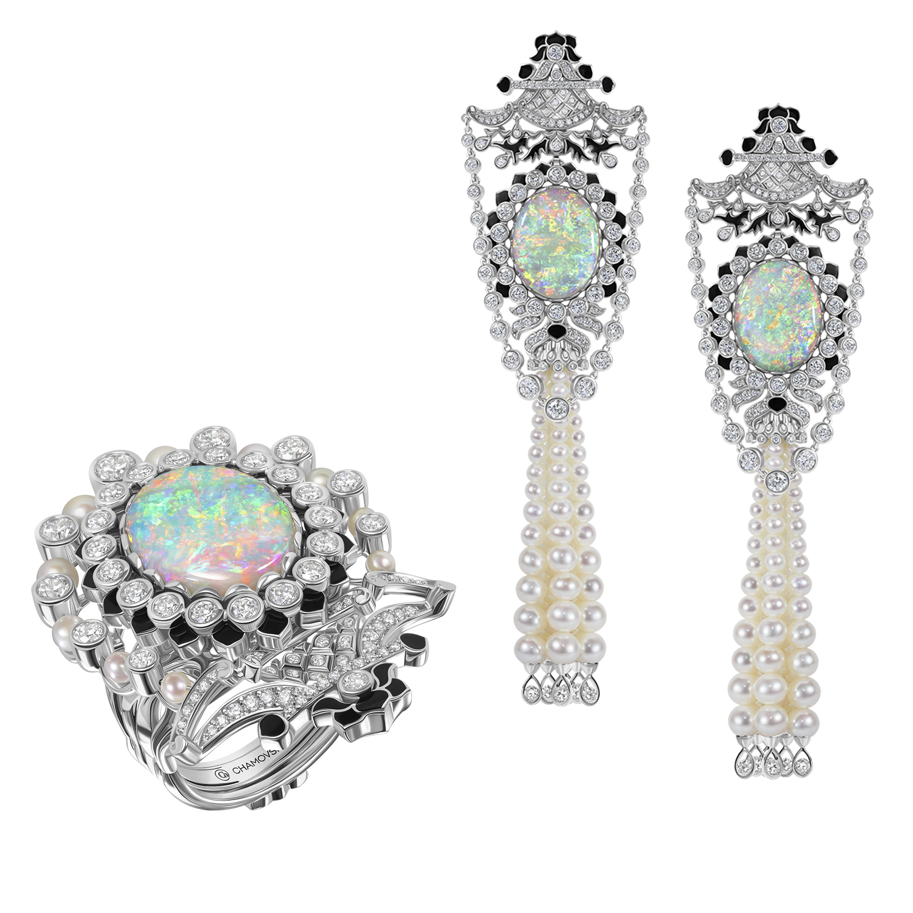 Ювелирный дом CHAMOVSKIKH в производстве украшений использует самоцветы лучших месторождений мира. Опалы, которыми инкрустируются украшения бренда, добываются в Австралии и Эфиопии, их качество подтверждено сертификатами авторитетных геммологических лабораторий. В собрании ювелирного дома CHAMOVSKIKH есть великолепный и очень редкий экземпляр - черный австралийский опал весом 62,26 ct. Камень такого порядка - истинное сокровище для искушенных особ.