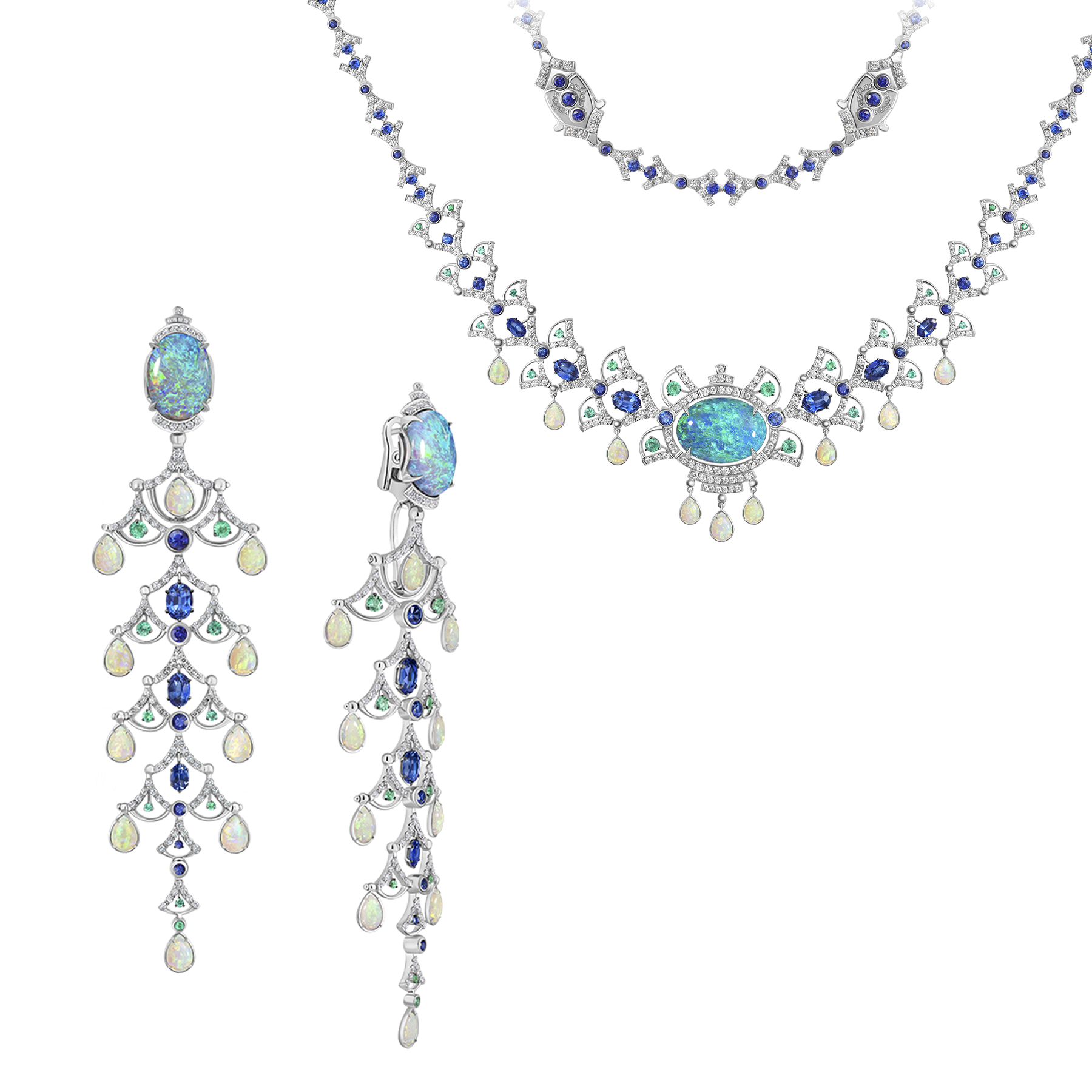 Мерцающие «капли» белых опалов и ритмичные переплетения природных сапфиров, изумрудов и бриллиантов в колье предвосхищают волшебное сияние и насыщенный цвет австралийского черного опала редкого бирюзового оттенка 18,78 ct.