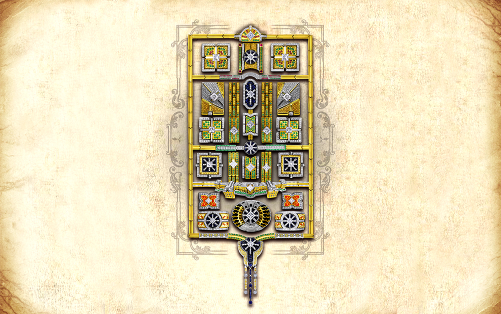 Центральная драгоценность коллекции — колье «Большой дворец». В его основе лежит объемная модель здания, созданного великим Б.Ф. Растрелли, запечатленная с высоты птичьего полета. Сверкающая бриллиантами и изумрудами инкрустация, а также геометрическая форма колье производят яркое впечатление, достойное исторического оригинала.