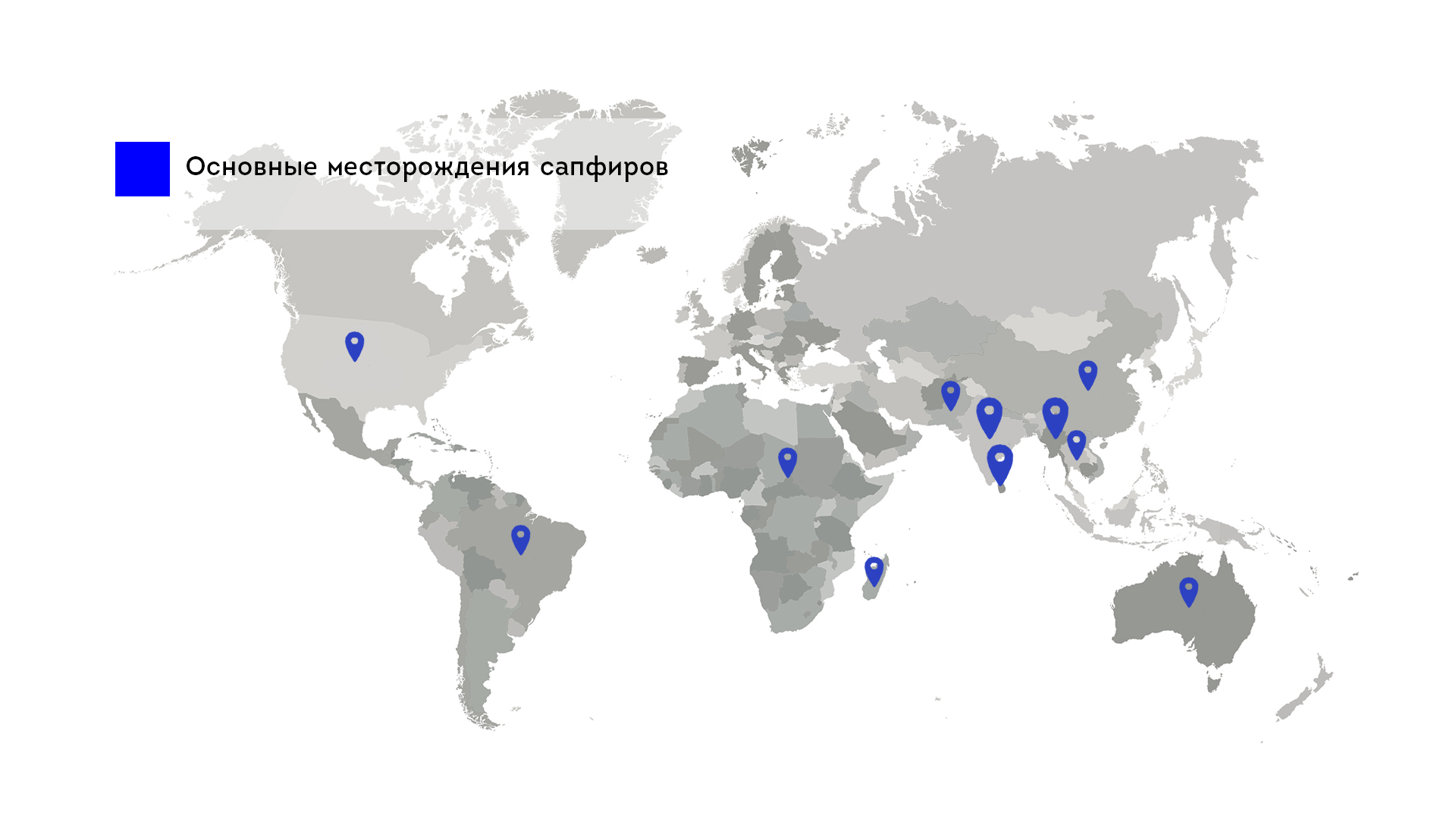 Драгоценные камни также добывают на Мадагаскаре, в Таиланде, Бразилии, Пакистане, Австралии, США, Китае и Африке. Австралия дает 80 % всей мировой добычи. Основная масса темно-синих, почти черных корундов приходит из Австралии и Китая.