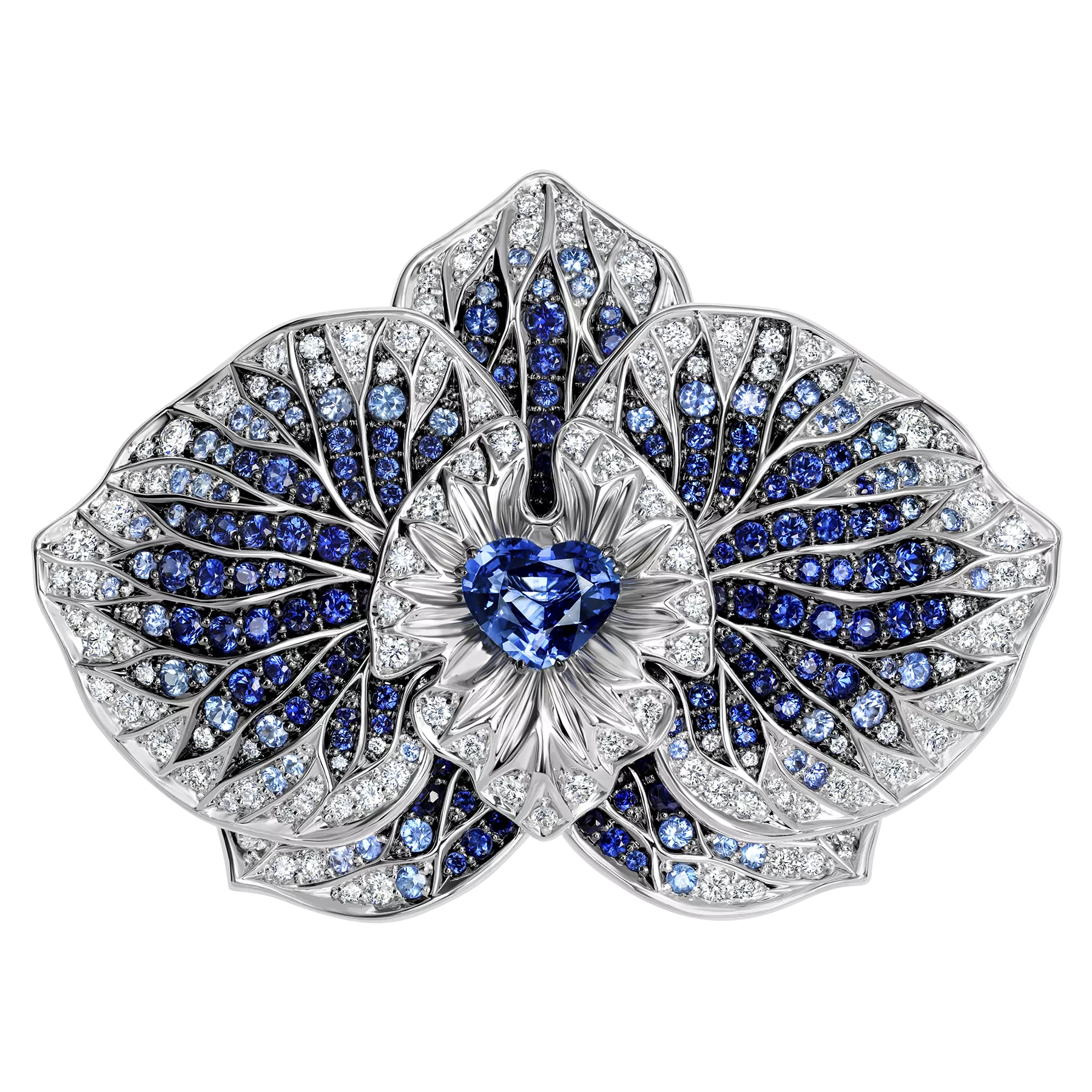 Брошь из лимитированной парюры L'amour de ma vie – атрибут утонченности и аристократичности. Восхитительную орхидею с драгоценной инкрустацией венчает сапфир 1,51 карат самой романтичной огранки «сердце».