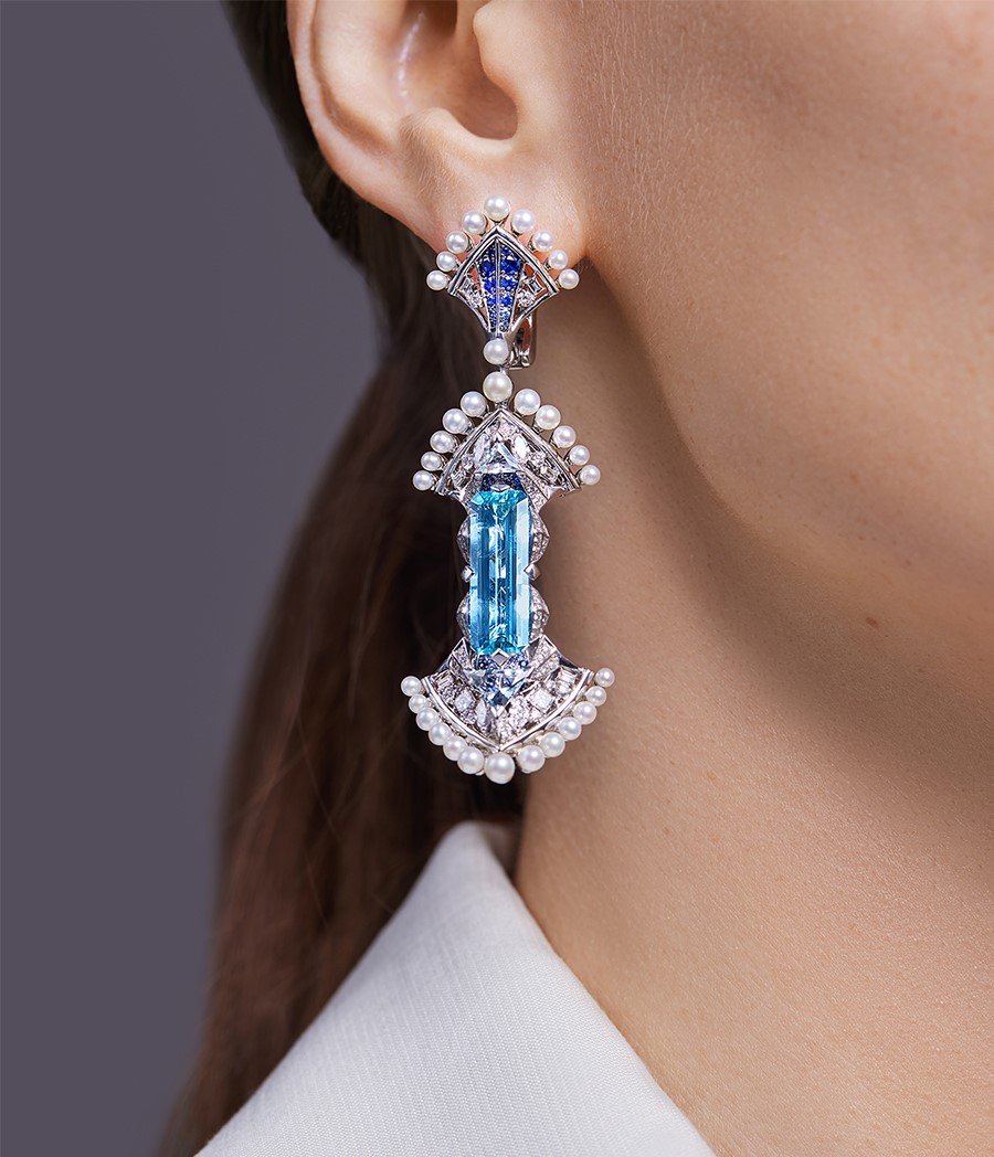 Наконец, зима воплощает кристаллизованную холодную красоту и завершение цикла. Серьги с аквамаринами и жемчугом передают эту снежную тишину, сокрытую в безупречно-чистых, словно арктический лед, голубых самоцветах, мягком мерцании жемчужин и ослепительном блеске бриллиантов. Геометричная форма аквамаринов, соединяясь с драгоценными ажурными узорами, создает сказочный и невероятно стильный образ.
