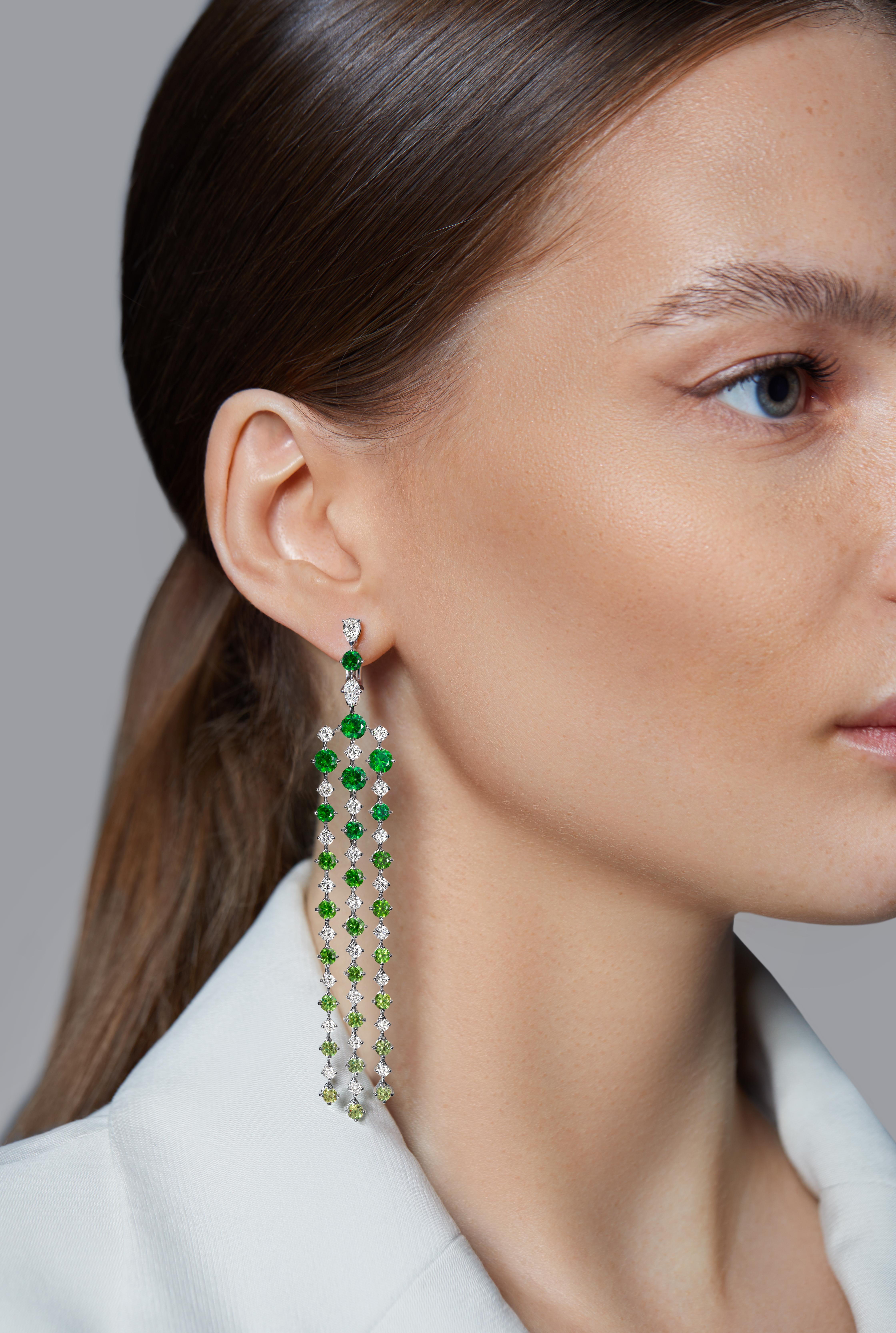 Весна, лето, осень и зима — постоянные метаморфозы в цикле времен года. Калейдоскоп красок распускающихся цветов, теплые объятия знойного летнего солнца, багряные оттенки осенней листвы и ослепительная белизна морозного снега, все это — выразительные и эфемерные явления, которыми можно наслаждаться только в определенный сезон, нашедшие отражение в украшениях Chamovskikh. Мягкие зеленые тона демантоидов в классических серьгах напоминают оттенки молодой листвы, символизируя новые начинания, обновление и радость.