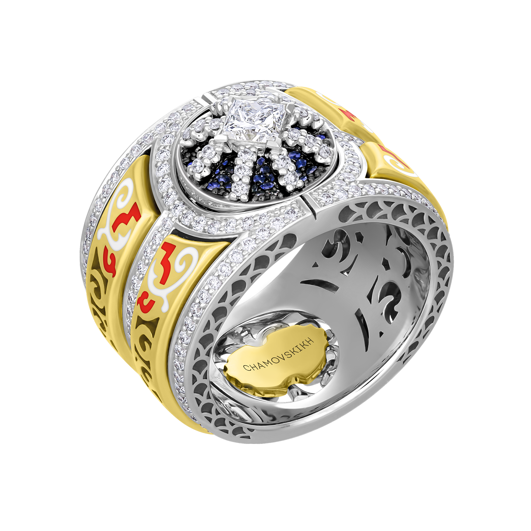 Кольцо с бриллиантами и сапфирами, жёлтое и белое золото, н.керамика