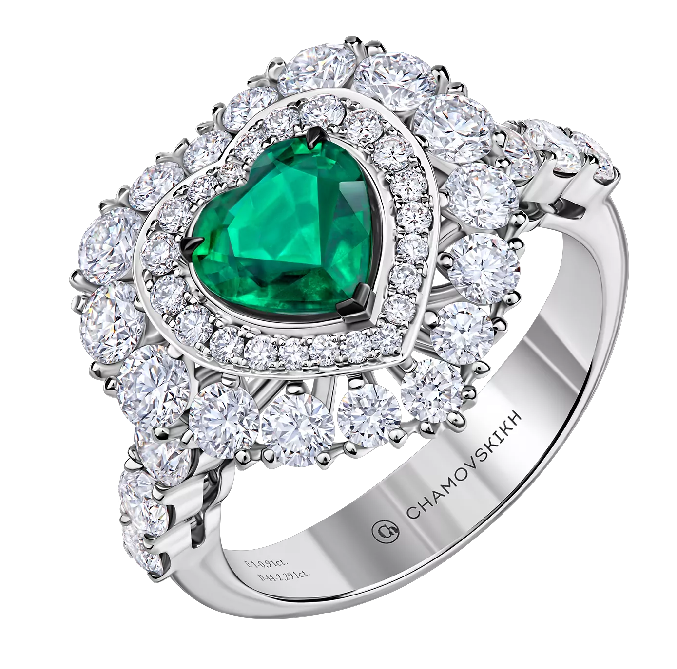 2. Изумрудное сердце 0,9 ct в кольце из коллекции Classic покоряет взор эталонным цветом Vivid Green. Насыщенный оттенок и великолепную оптику изумруда усиливает двойной ореол из 40-а бриллиантов.