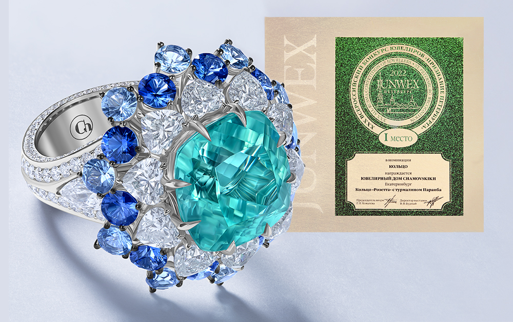 Эксклюзивное кольцо «Розетта» с редким турмалином параиба от ювелирного дома CHAMOVSKIKH стало победителем всероссийского конкурса «JUNWEX Петербург». Стоит отметить, что претендентами на победу в одном из самых авторитетных событий российского ювелирного мира становятся эксклюзивные украшения, обладающие высокой художественной ценностью. Вереница бриллиантов, сапфиров и аквамаринов создают в кольце «Розетта» оригинальную игру различных оттенков синего, подчеркивая уникальность центрального камня. Но главную роль в украшении играет коллекционный турмалин параиба весом 9,98 ct. Завораживающая природная красота, редкая для параибы чистота, великолепный цвет и характерное неоновое свечение не оставили равнодушным никого, в том числе, и членов профессионального жюри.