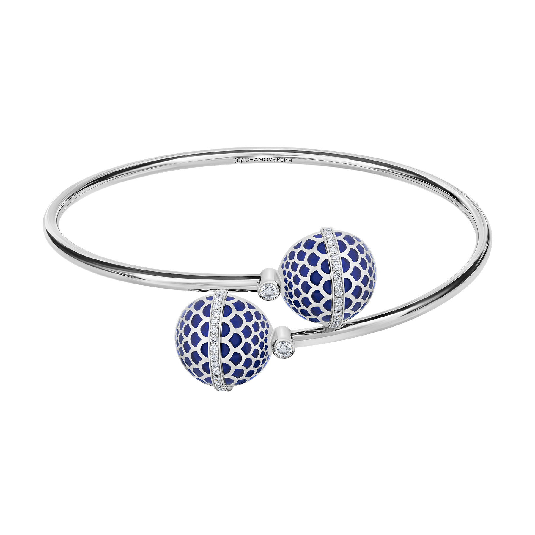 Еще один пример современной интерпретации стилистики ар-деко — лаконичный разъемный браслет из коллекции Jazz Age. Оригинальность украшению придает пара золотых сфер, инкрустированных бриллиантами. Ультрапрочная нанокерамическая эмаль благородного синего оттенка защищает украшение от повреждений и создает выразительный цветовой акцент. Идеальный выбор для активного летнего отдыха.