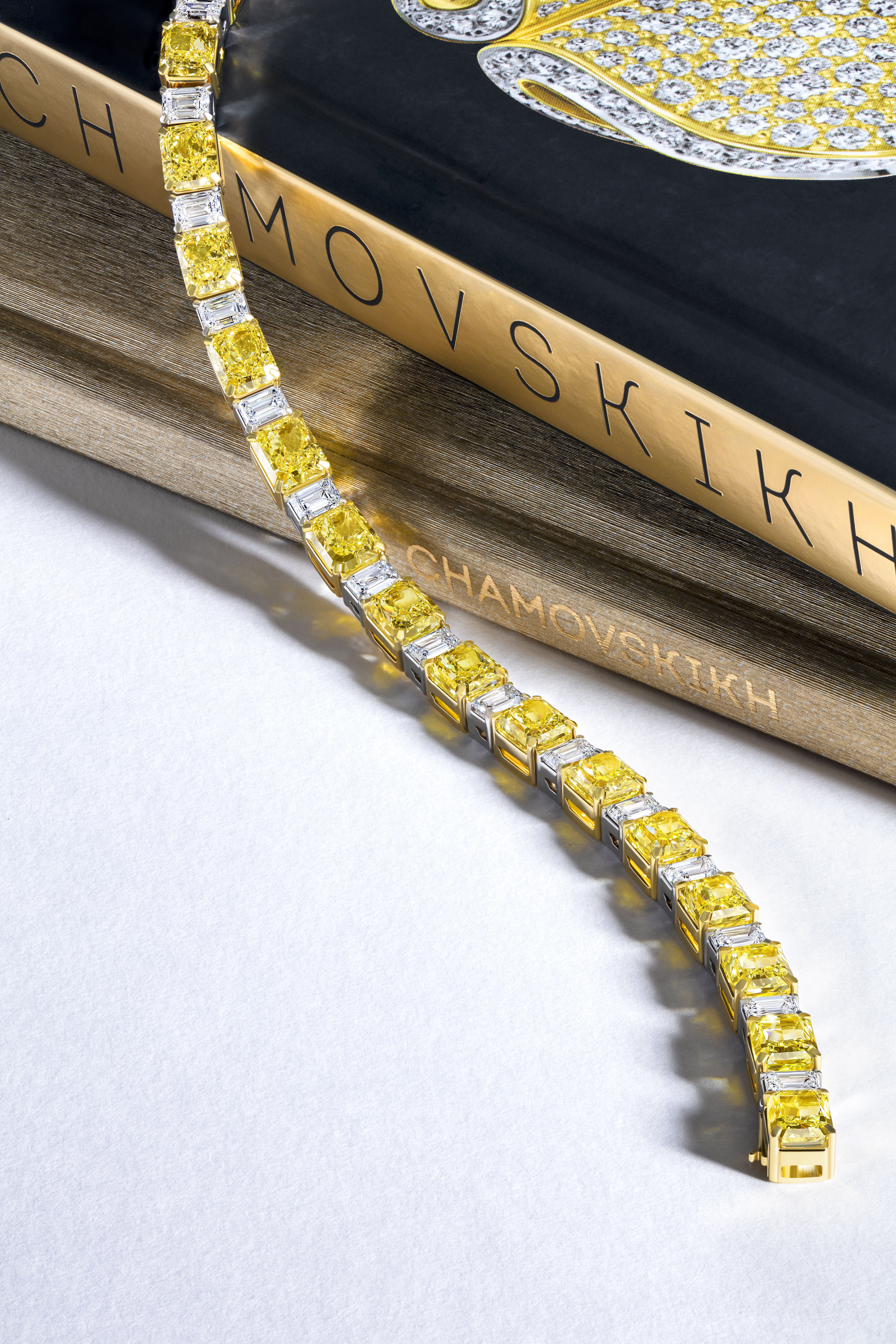 Ювелиры CHAMOVSKIKH представляют свежее прочтение даже такого классического украшения, как теннисный браслет. Сочетание бесцветных и фантазийных Fancy Yellow бриллиантов создает игру, не уступающую по своей интенсивности сиянию солнечных лучей. Превосходные характеристики драгоценных камней наделяют украшение высокой инвестиционной ценностью, что актуально вне зависимости от времени года.