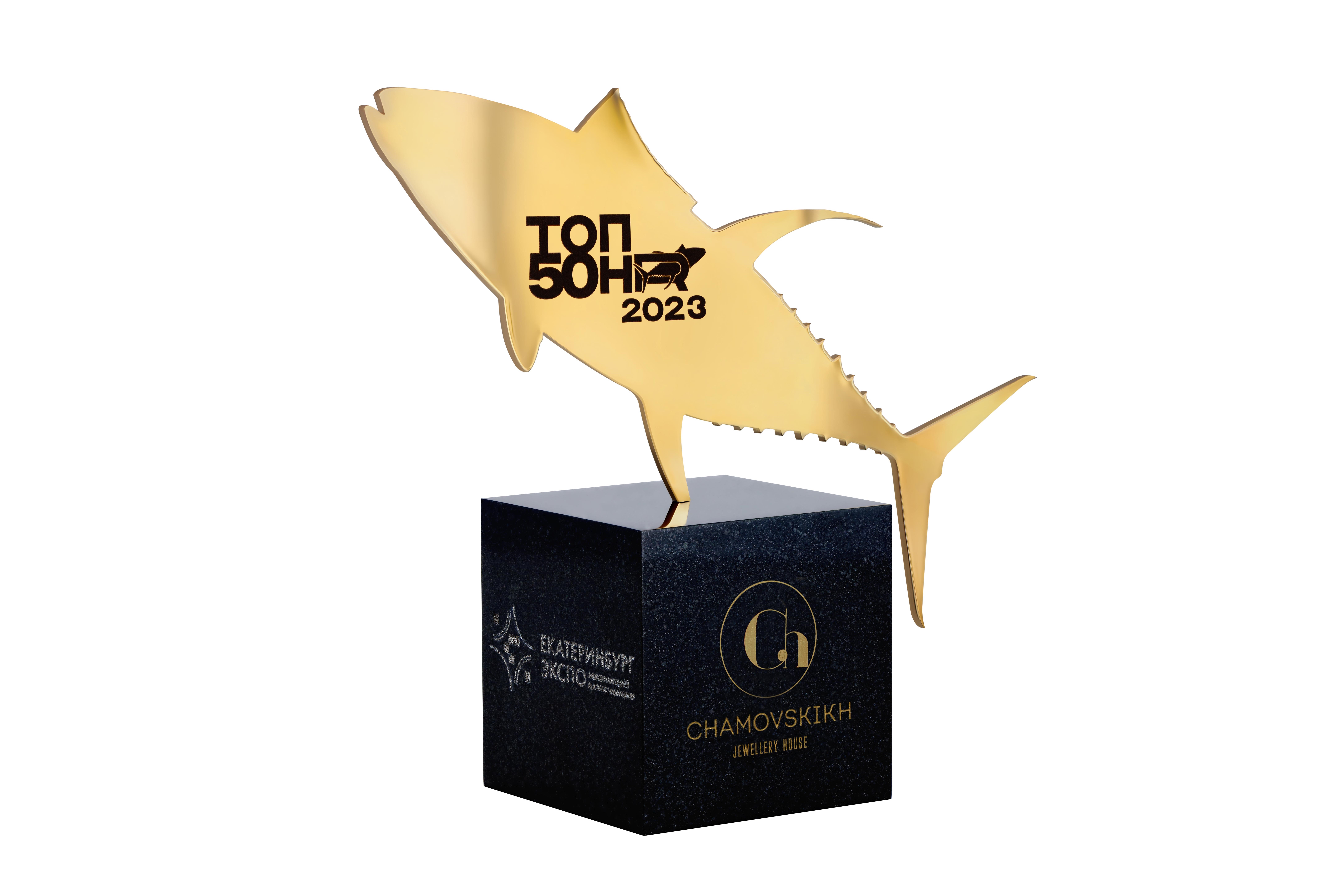 50 лидеров рейтинга стали обладателями наград, созданных ювелирным домом CHAMOVSKIKH. На кубическом основании из ценного камня — долерита возвышается брендированный бронзовый силуэт тунца — главного символа Форума.