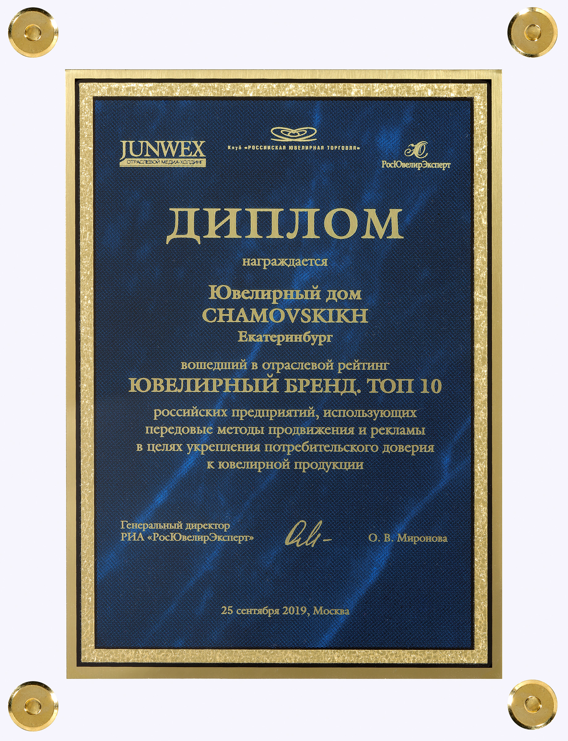 Ювелирный дом CHAMOVSKIKH вошел в Топ-10 ювелирных брендов России. Профильное агентство «РосЮвелирЭксперт» отметило CHAMOVSKIKH за передовые методы продвижения, а также за высокие оценки и доверие ценителей ювелирного искусства.