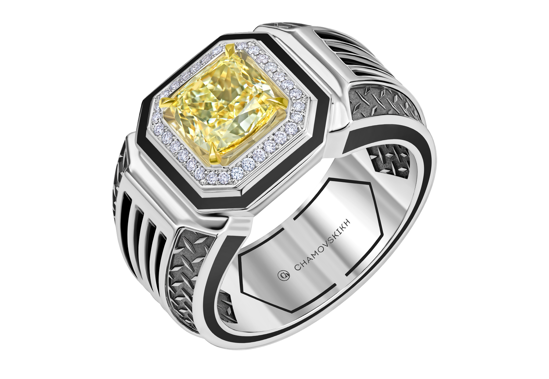 Невероятно статусное мужское кольцо с инвестиционным Fancy Yellow бриллиантом 3,3 ct создано для того, кто привык выбирать лучшее. Трендовая огранка Cushion и инкрустация из 33 бриллиантов, соединяясь с выразительным дизайном, создает запоминающийся образ.