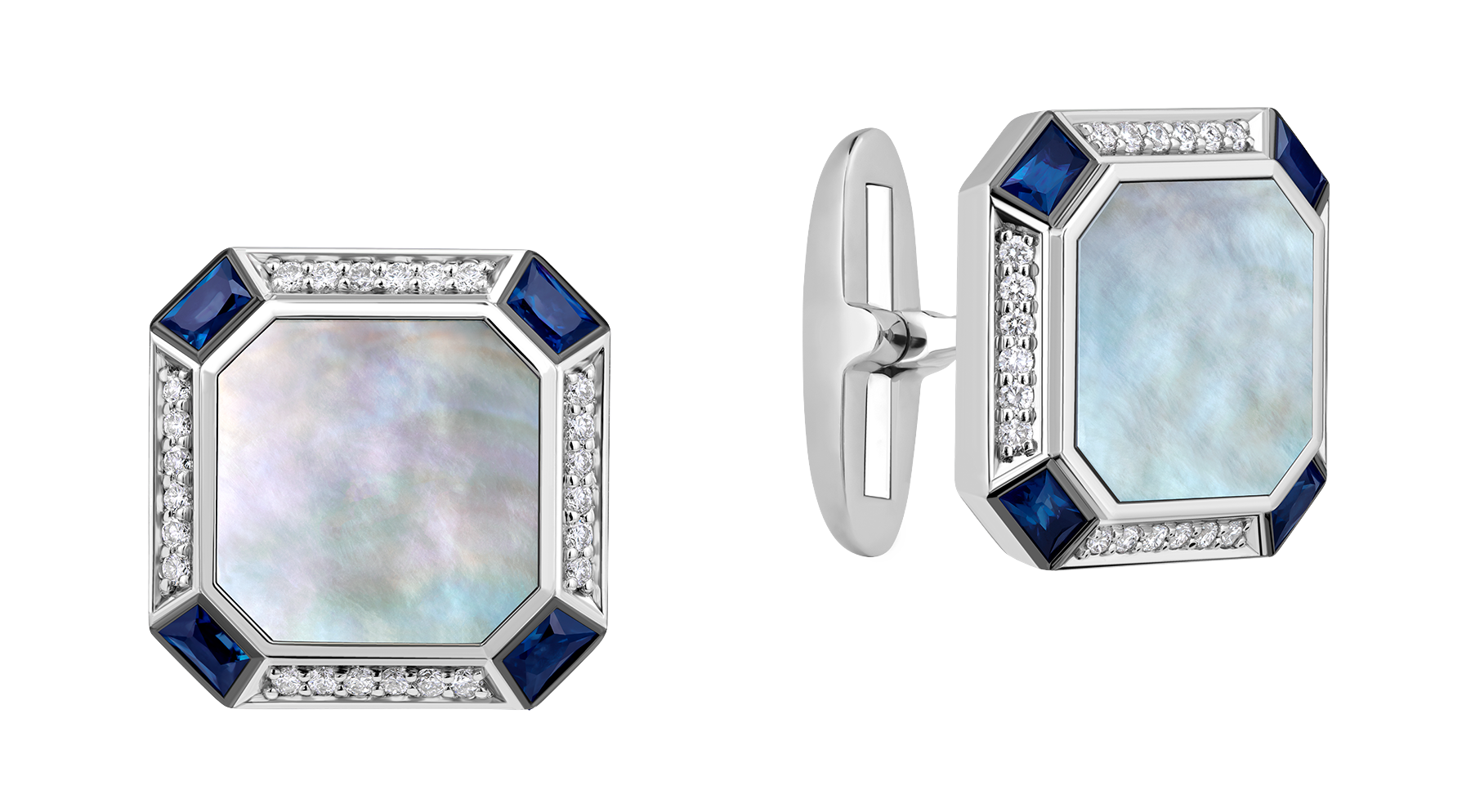 Запонки из белого золота с перламутровыми вставками для стильных образов. Центральные элементы, окруженные инкрустацией из 48 бриллиантов и восьми сапфиров, создают оригинальный и вместе с тем сдержанный, статусный аксессуар.
