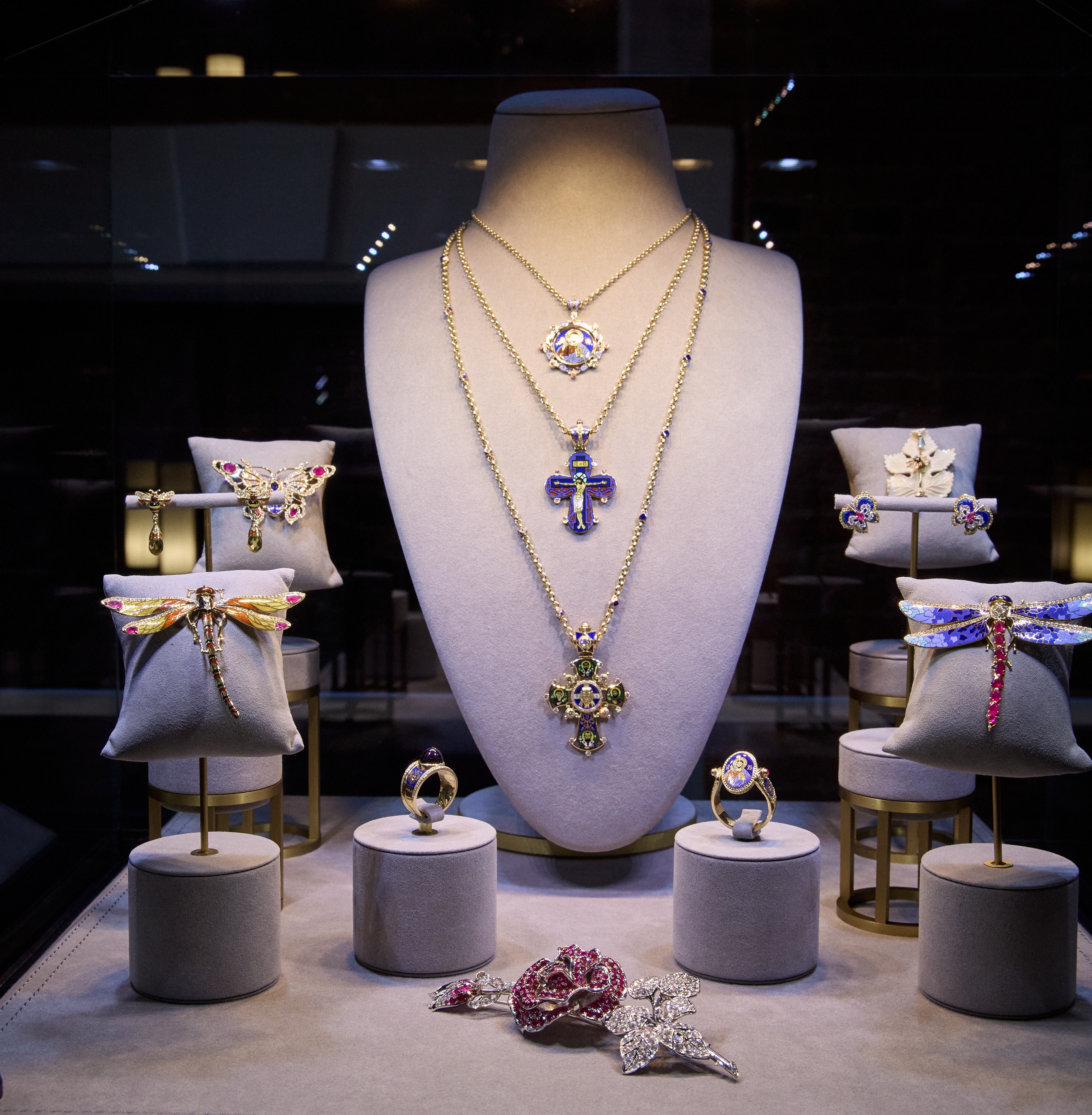Мастерская Анатолия Литвинова сделала акцент на региональную идентичность: в концептуальных украшениях, представленных на выставке, нашли отражение как природа Сибири, так и византийское искусство, славившееся созданием украшений в технике горячей эмали.